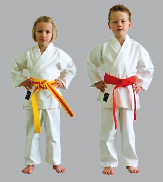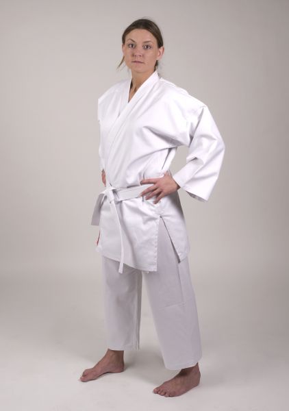 Einsteigermodell, 100 % Baumwolle, reinweiß, leichtes Material, in stabiler Qualität, solide verarbeitet. Jacke und Hose knöchellang. Hose mit Elasticbund mit zusätzlicher Schnürung, mit weißem Gürtel. In den Größen 100 cm bis 200 cm. Merkmale * Schnitt: Traditionell * Jacke: Lange Ärmel * Hose: Elasticbund und Zugverschluß