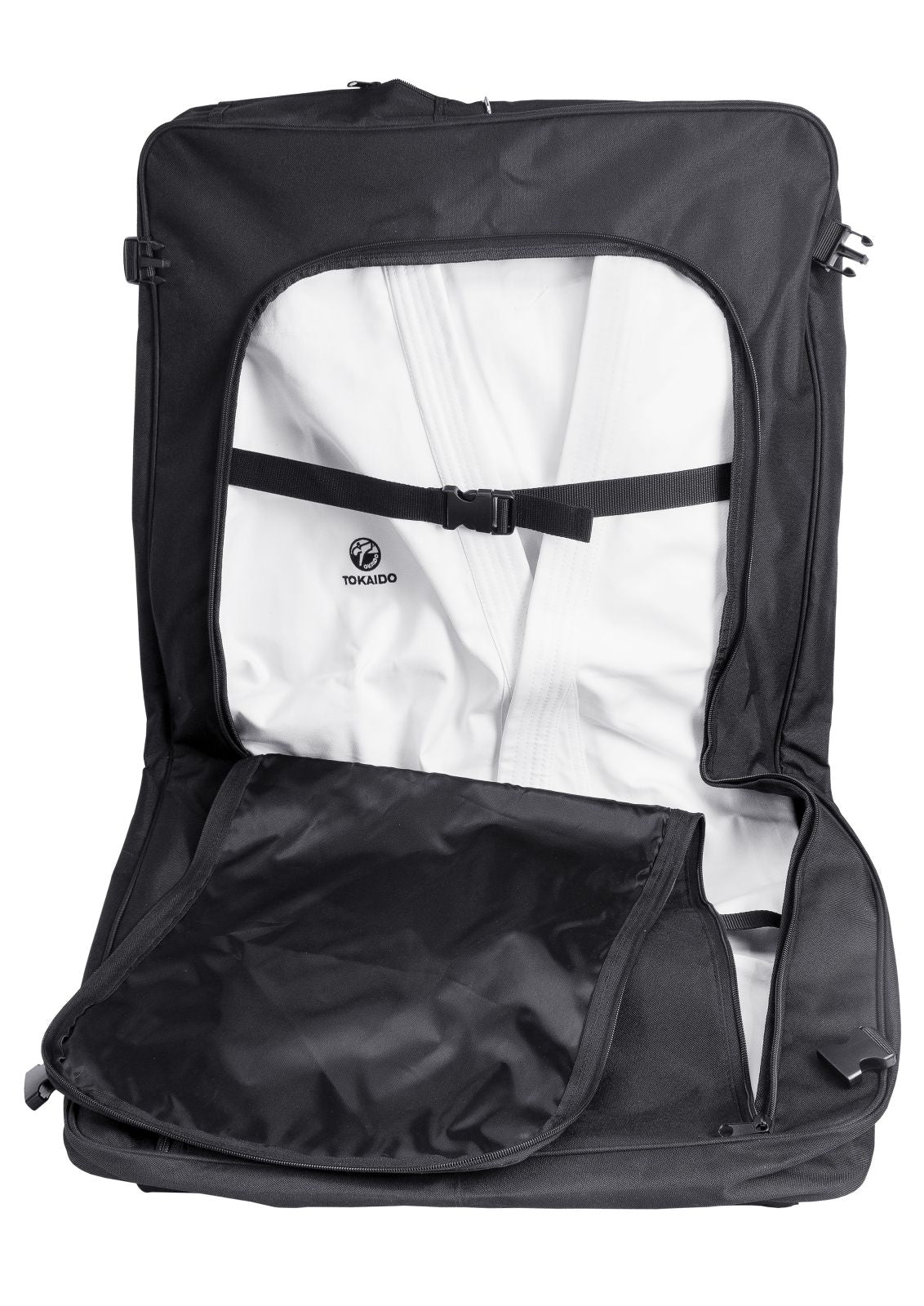 Dank dieser praktischen Tasche von Tokaido bleibt dein Gi selbst nach einer langen Reise faltenfrei und sauber. Und so geht es: Die Umhängetasche aufklappen, den Karateanzug in das dafür vorgesehene Fach reinlegen und befestigen. Anschließend den Reißverschluss schließen und die Tasche wieder zusammenklappen - fertig! Material: Polyester. Großes Außenfach mit Reißverschluss, verstellbarer Schultergurt. Maße (zugeklappt): ca. 54 x 48 x 15 cm Maße (aufgeklappt): ca. 54 x 100 x 7,5 cm